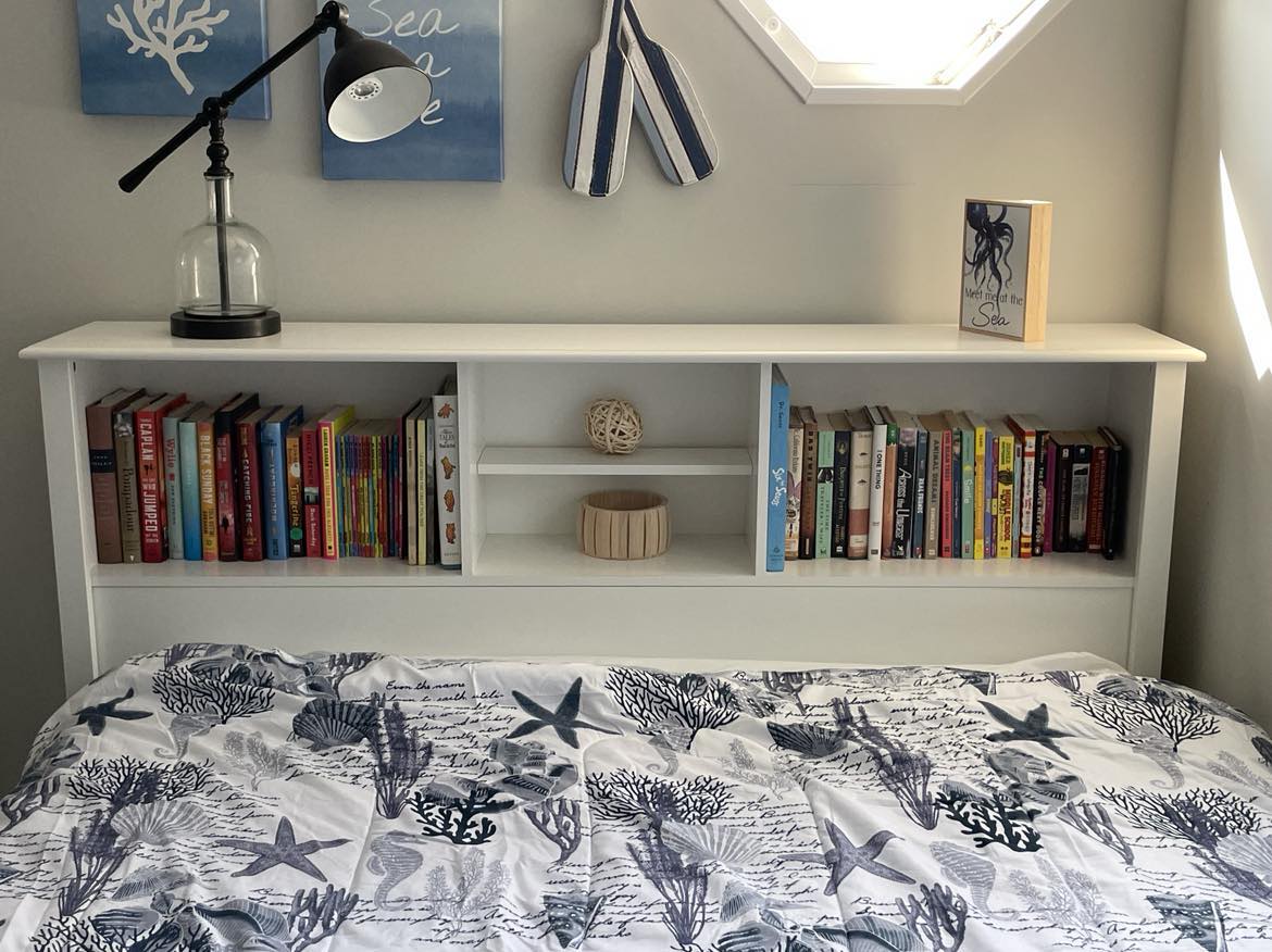 Bedroom two: The Library! Queen sized bed, lending library in the bookcase headboard. Need a book to read at the beach? I’ll bet we have one you’d like! There are options for the kids too!