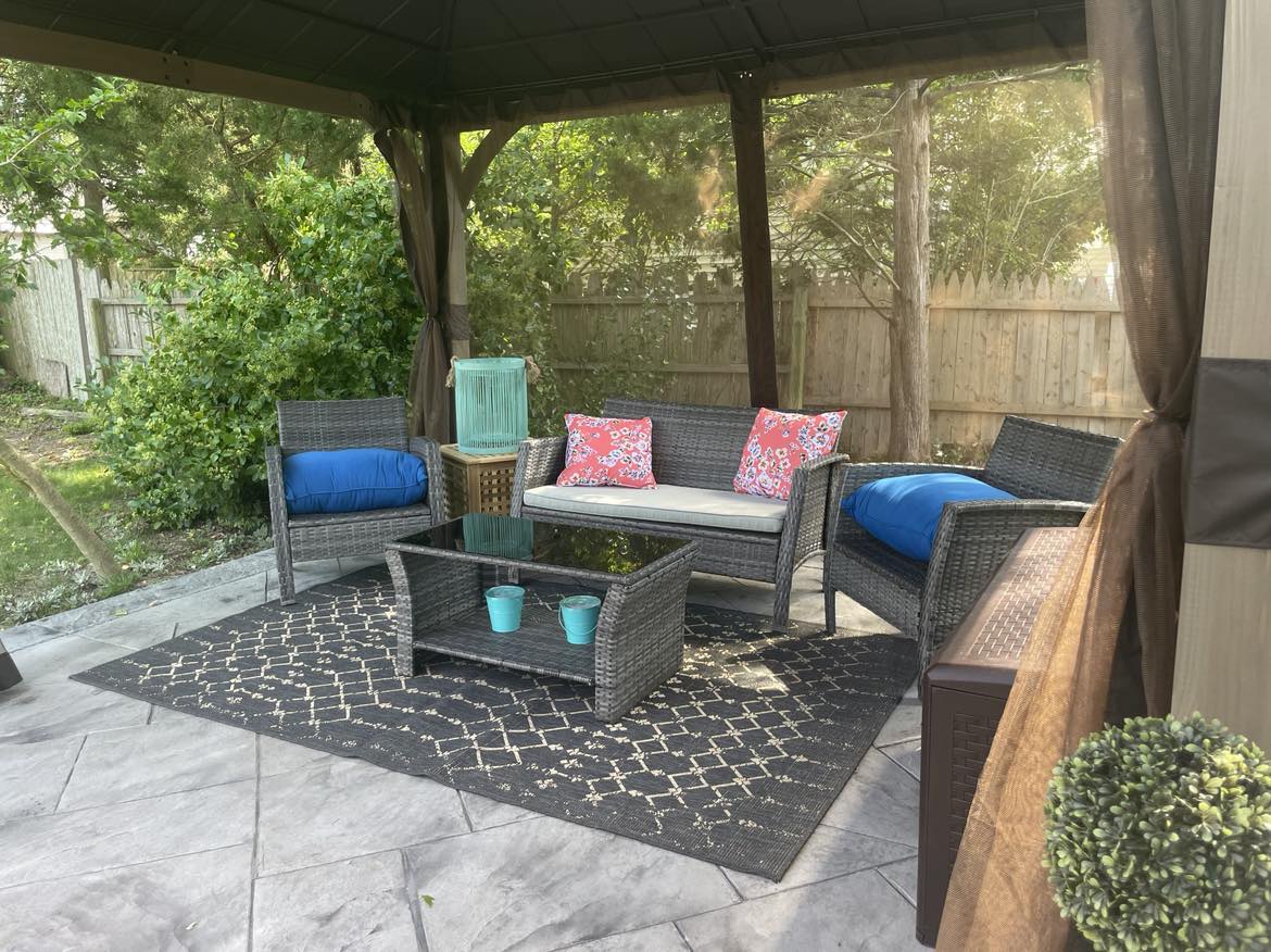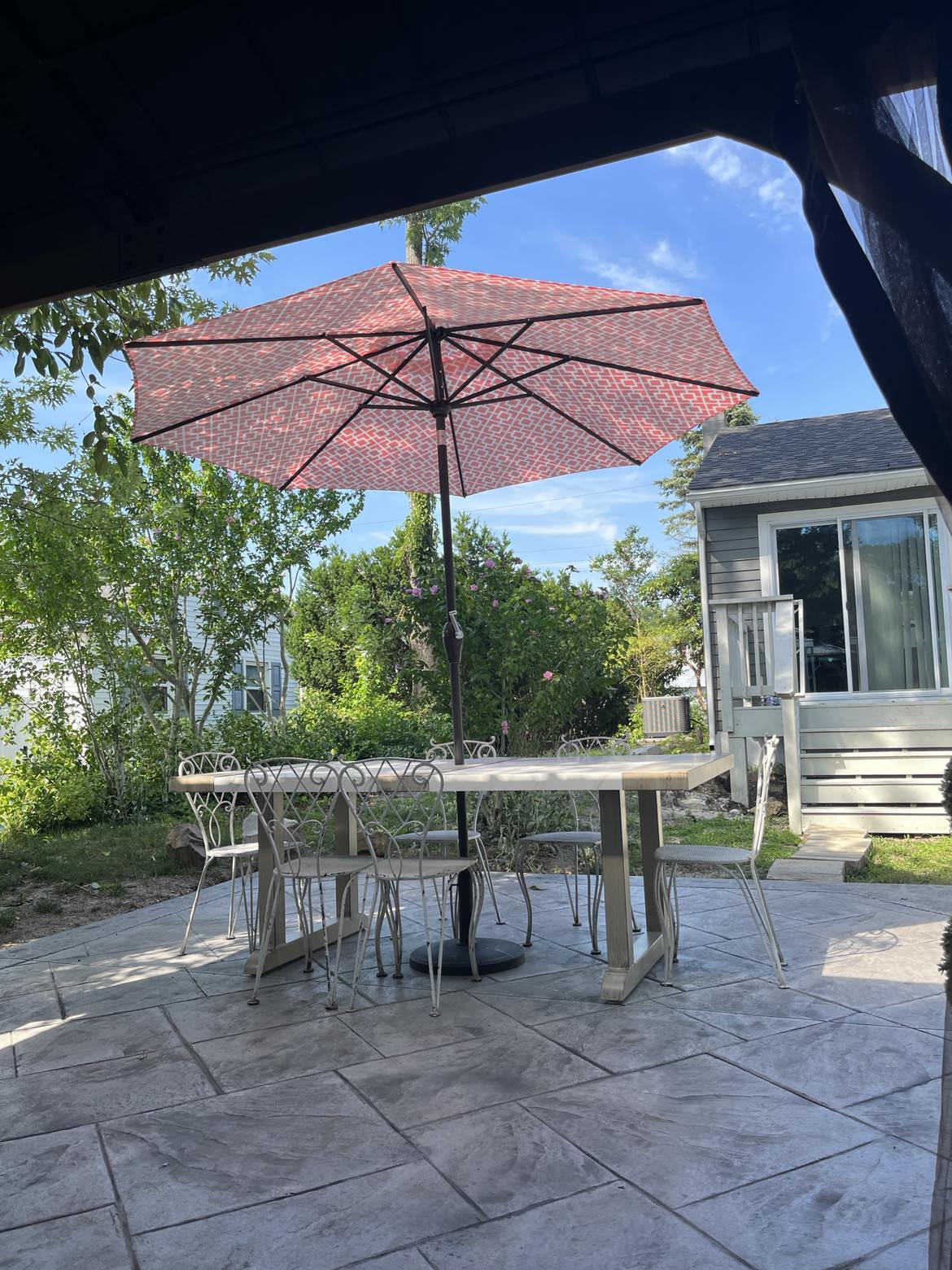 After dinner, head out to the private back yard. Flowering trees, chirping birds and room for the whole family to spread out. Updated landscaping is coming in the fall but for now there is a beautiful new patio that features a gazebo with netting plus a table with seating outside for 8. If you need to clean off your beach gear, there’s a hose available. Outdoor shower coming soon.
